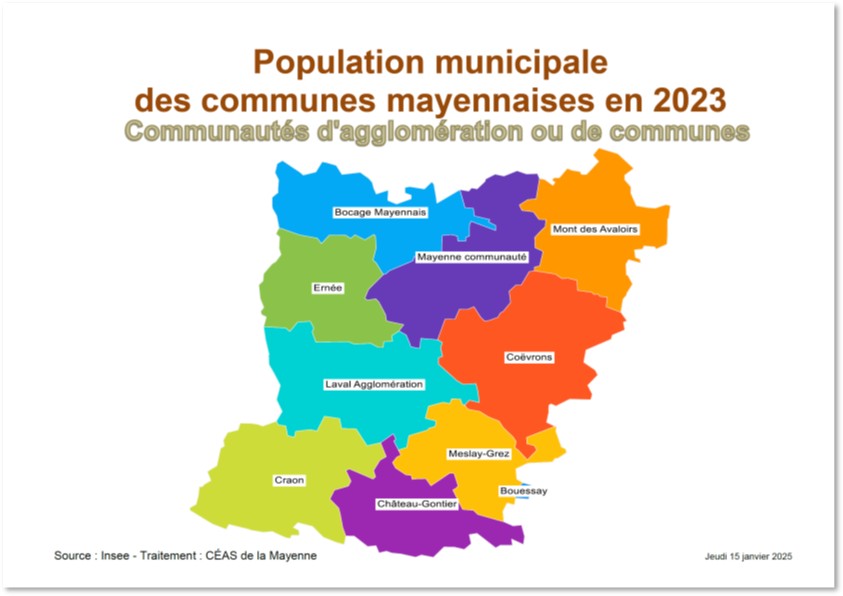 le des communes mayennaises de 1990 à 2023, par communauté d'agglomération ou de communes (source : Insee - traitement : CÉAS de la Mayenne)