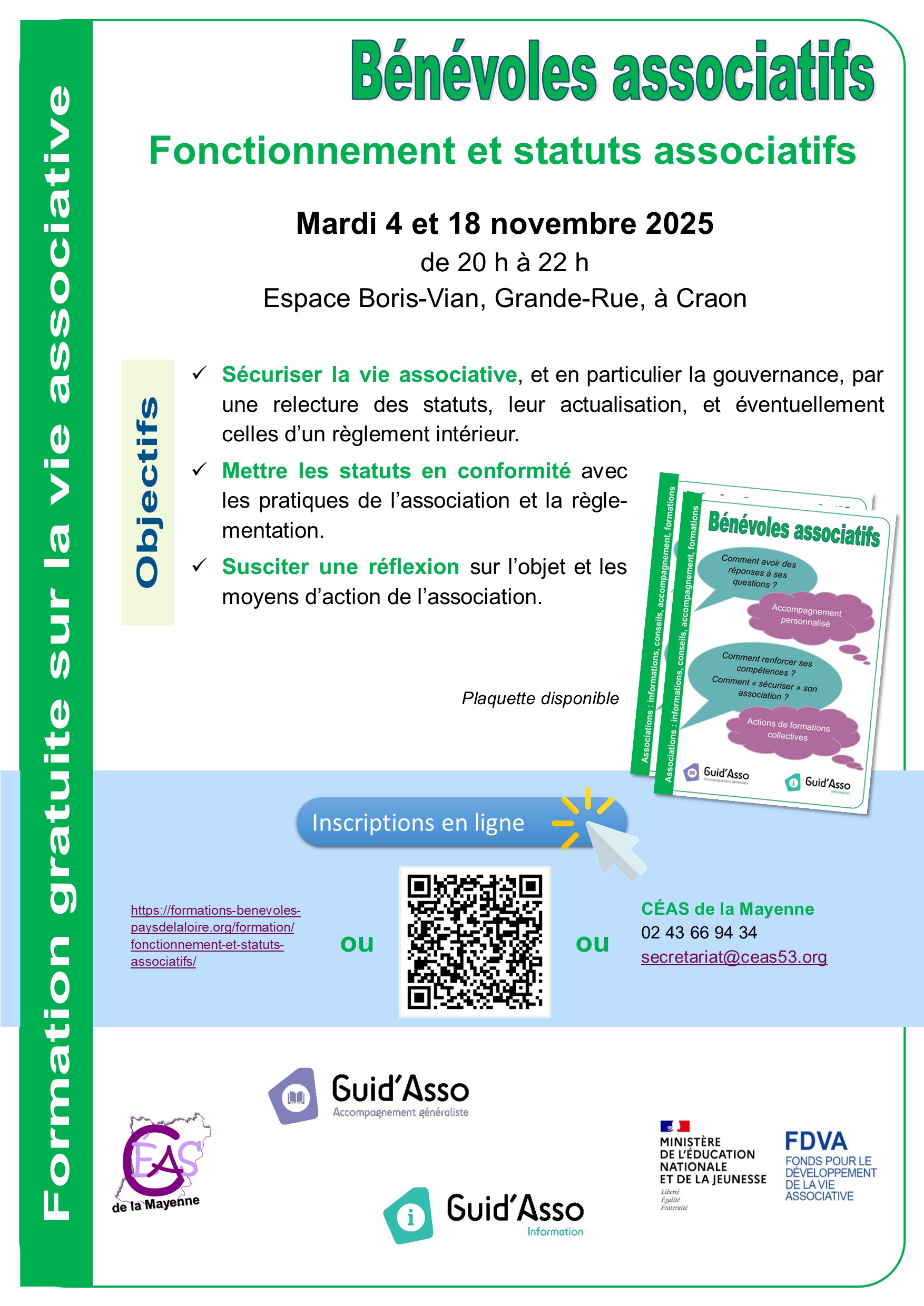 - Craon : les mardis 4 et 18 novembre 2025, de 20 h à 22 h (affiche jointe) : https://formations-benevoles-paysdelaloire.org/formation/fonctionnement-et-statuts-associatifs-2/